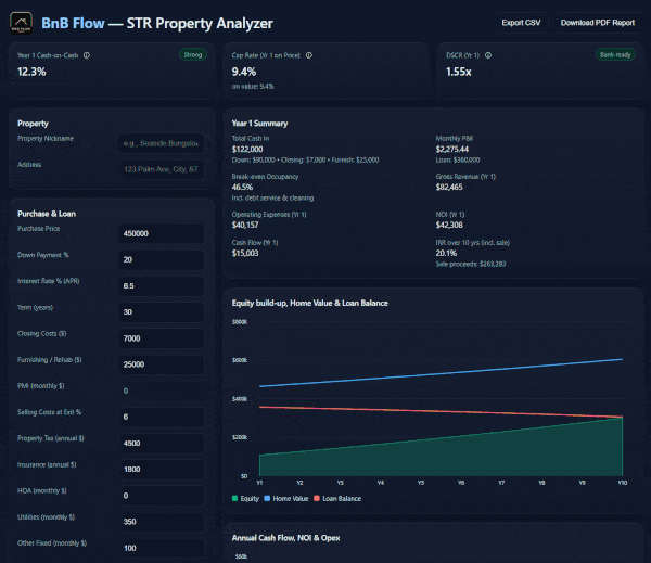 Say goodbye to messy spreadsheets. The new BnB Flow STR Property Analyzer is built to give you professional-grade clarity on every deal — cash flow, returns, financing, and equity projections — all in one place.